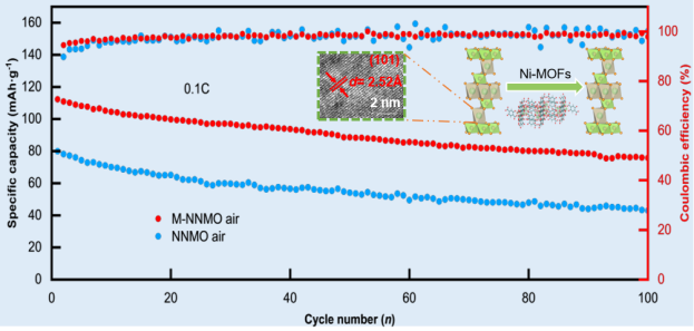 商用钠离子电池中使用的一种主要正极材料是O3型NaNi0.5Mn0.5O2。这种材料的应用受到多级相变和空气稳定性不足的阻碍。在这项研究中,开发了一种源自Ni-MOFs的创新型O3型NaNi0.5Mn0.5O2(简称 M-NNMO)作为钠离子电池的正极材料。M-NNMO阴极在2.0至4.0 V内以0.1 C的速率表现出 124 mAh·g-1 的放电比容量。此外,这种材料在经过100次循环后表现出令人印象深刻的75%容量保持率。Ni-MOFs可以通过增强过渡金属-氧键和扩大Na层间隙来抑制复杂的相变并同时提高离子扩散速率,这是显着提高性能的原因。重要的是,在空气稳定性测试中,基于 Ni-MOFs 的独特结构特性,M-NNMO过渡金属层的稳定性得到了增强。这项工作将为设计性能优越的钠离子电池正极材料提供理论指导。研究得到国家自然科学基金、海南省自然科学基金等项目联合资助。