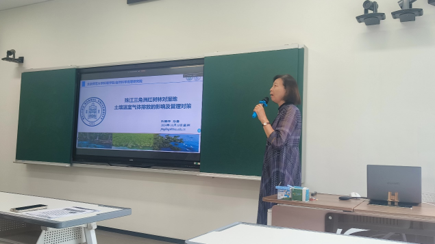 刘静玲教授以 “珠江三角洲红树林对土壤温室气体排放的影响及管理对策” 为主题,借助研究案例 —— 珠三角,生动阐释了红树林在固碳方面的卓越功效。并采用小组研讨形式,引导同学们自主探究红树林的保护与修复,同时进行补充答疑。刘玉学副研究员则以 “基于生物炭稳定性的农田土壤固碳效应” 为题,详细介绍了生物炭对土壤有机碳的激发效应及有机碳组分的影响等内容。期间,通过提问互动,为同学们答疑解惑,加深理解。