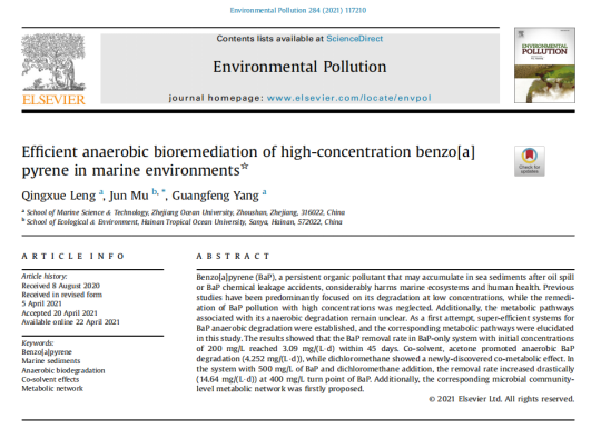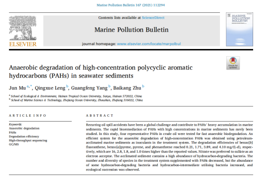 近来,太阳成集团tyc7111cc教授穆军团队在海洋溢油沉积物中多环芳烃的生物修复方面取得一系列重要进展,以公司为唯一通讯单位,先后在《Environmental Pollution》上发表《海洋环境中高浓度苯并芘的高效厌氧生物修复》;在《Marine Pollution Bulletin》上发表《海水沉积物中高浓度多环芳烃的厌氧降解》成果。