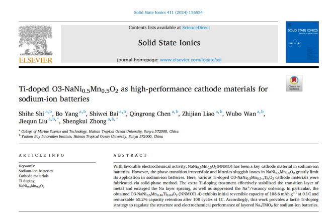 近日,公司资源与环境专业硕士研究生史世和同学以第一作者,以公司为唯一单位及唯一通讯单位,在环境材料领域期刊Solid State Ionics上发表题为“Ti-doped O3-NaNi0.5Mn0.5O2 as high-performance cathode materials for sodium-ion batteries”的学术论文。钟胜奎老师为文章通讯作者。